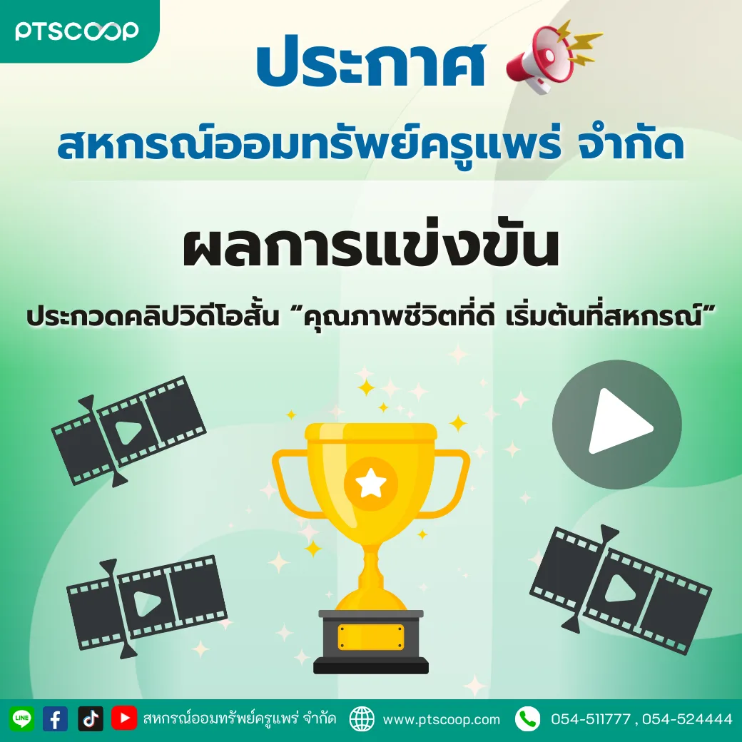 📣 ตามที่สหกรณ์ออมทรัพย์ครูแพร่ จำกัด ได้ประกาศการประกวดคลิปวิดีโอสั้น ภายใต้หัวข้อ “คุณภาพชีวิตที่ดี เริ่มต้นที่สหกรณ์” เมื่อวันที่ 1 สิงหาคม พ.ศ. 2568 และได้เปิดรับผลงานเข้าร่วมประกวดจนถึงวันที่ 15 กันยายน 2568 พร้อมทั้งเปิดให้สมาชิกรับชมผลงานระหว่างวันที่ 1 – 25 ตุลาคม 2568 นั้น