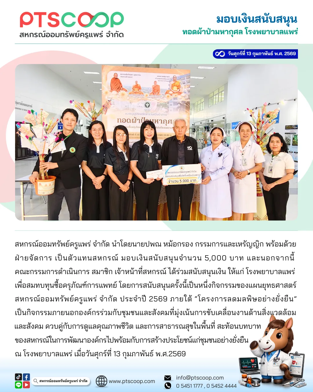 การสนับสนุนครั้งนี้เป็นหนึ่งในกิจกรรมตามแผนยุทธศาสตร์สหกรณ์ออมทรัพย์ครูแพร่ จำกัด ประจำปี 2569 ภายใต้ “โครงการลดมลพิษอย่างยั่งยืน” ซึ่งเป็นกิจกรรมภายนอกองค์กรร่วมกับชุมชนและสังคม มุ่งเน้นการขับเคลื่อนงานด้านสิ่งแวดล้อมและสังคม ควบคู่กับการดูแลคุณภาพชีวิต และการสาธารณสุขในพื้นที่