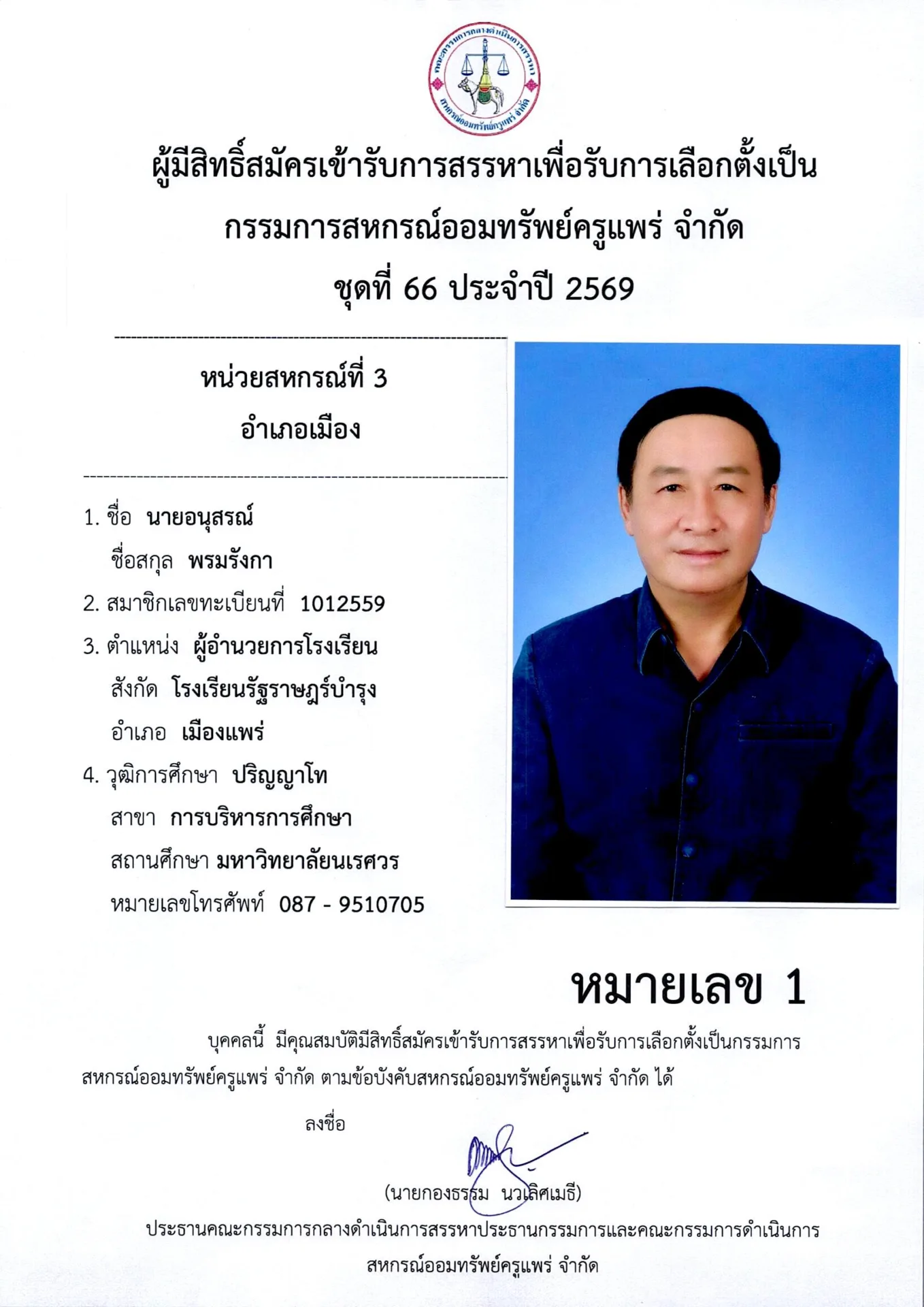 รายชื่อผู้มีสิทธิสมัครเข้ารับการสรรหาเพื่อรับการเลือกตั้งเป็นกรรมการประจำหน่วย สอ.ครูแพร่