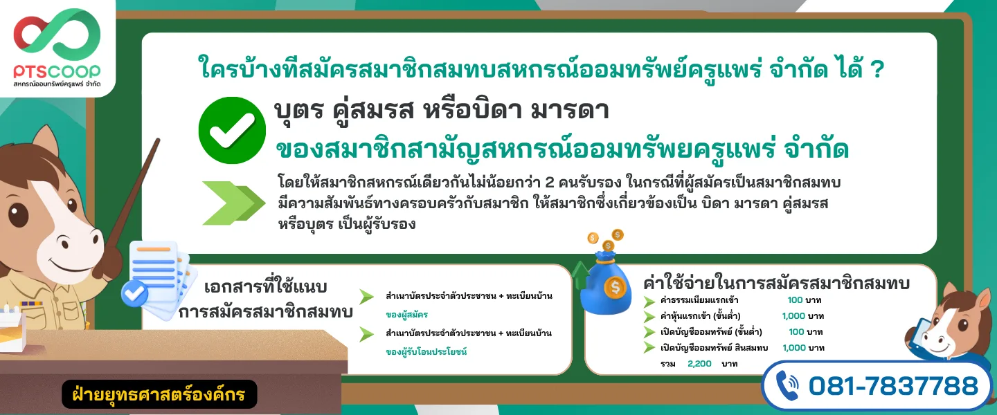 เป็นบุตร (อายุ 20 ปีบริบูรณ์ขึ้นไป) หรือคู่สมรส หรือบิดา มารดา ของสมาชิกสามัญสหกรณ์ออมทรัพย์ครูแพร่ จำกัด